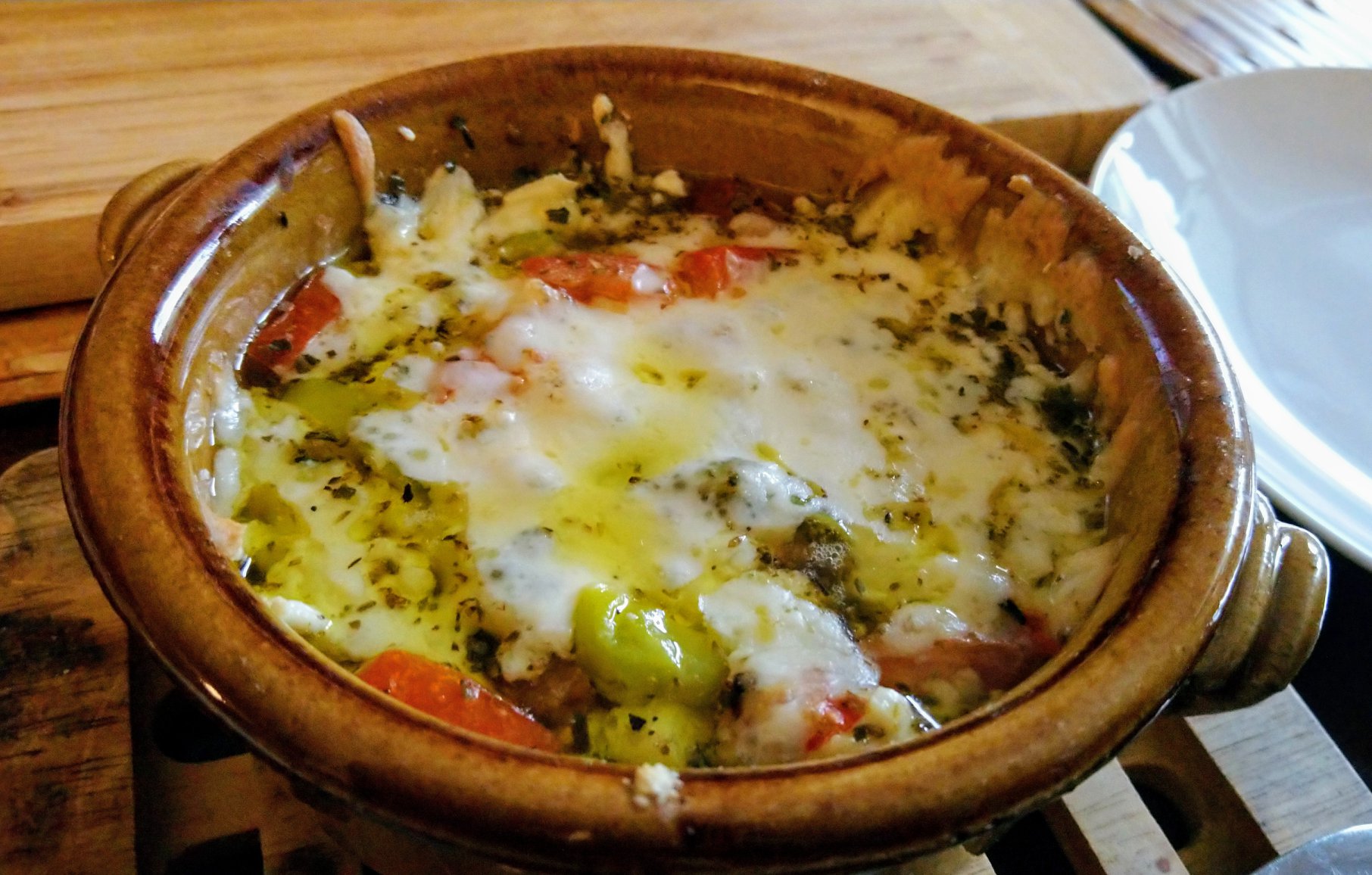 Τώρα προσθέτω τις υπόλοιπες φέτες κασεριού και τις πράσινες πιπεριές. Περιχύνω με ελαιόλαδο και τελειώνω με μερικές νιφάδες τσίλι και λίγη αποξηραμένη ρίγανη.