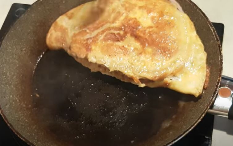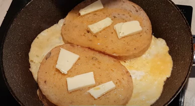 4. Βάζω λίγο βούτυρο στις φέτες ψωμιού και αναποδογυρίζω όλο μαζί το μείγμα, δηλαδή τα αυγά με το ψωμί.