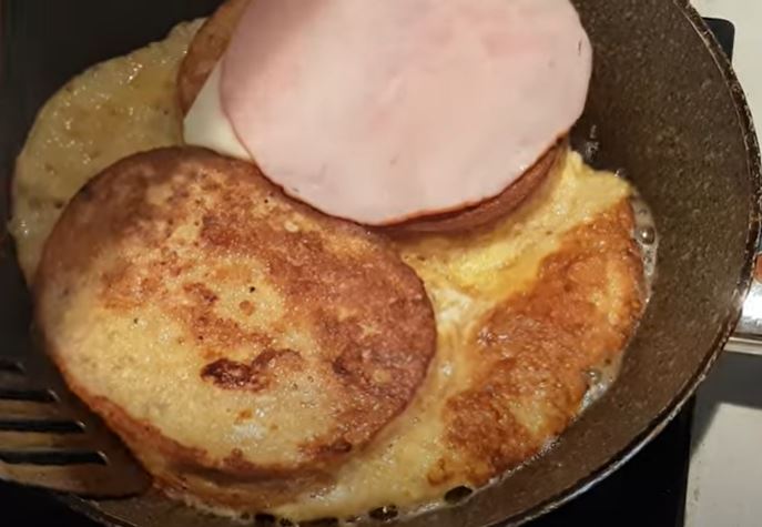 5. Ψήνω έτσι για περίπου 1 λεπτό και αναποδογυρίζω ξανά. βάζω το τυρί και το ζαμπόν πάνω στη μία φέτα ψωμιού.