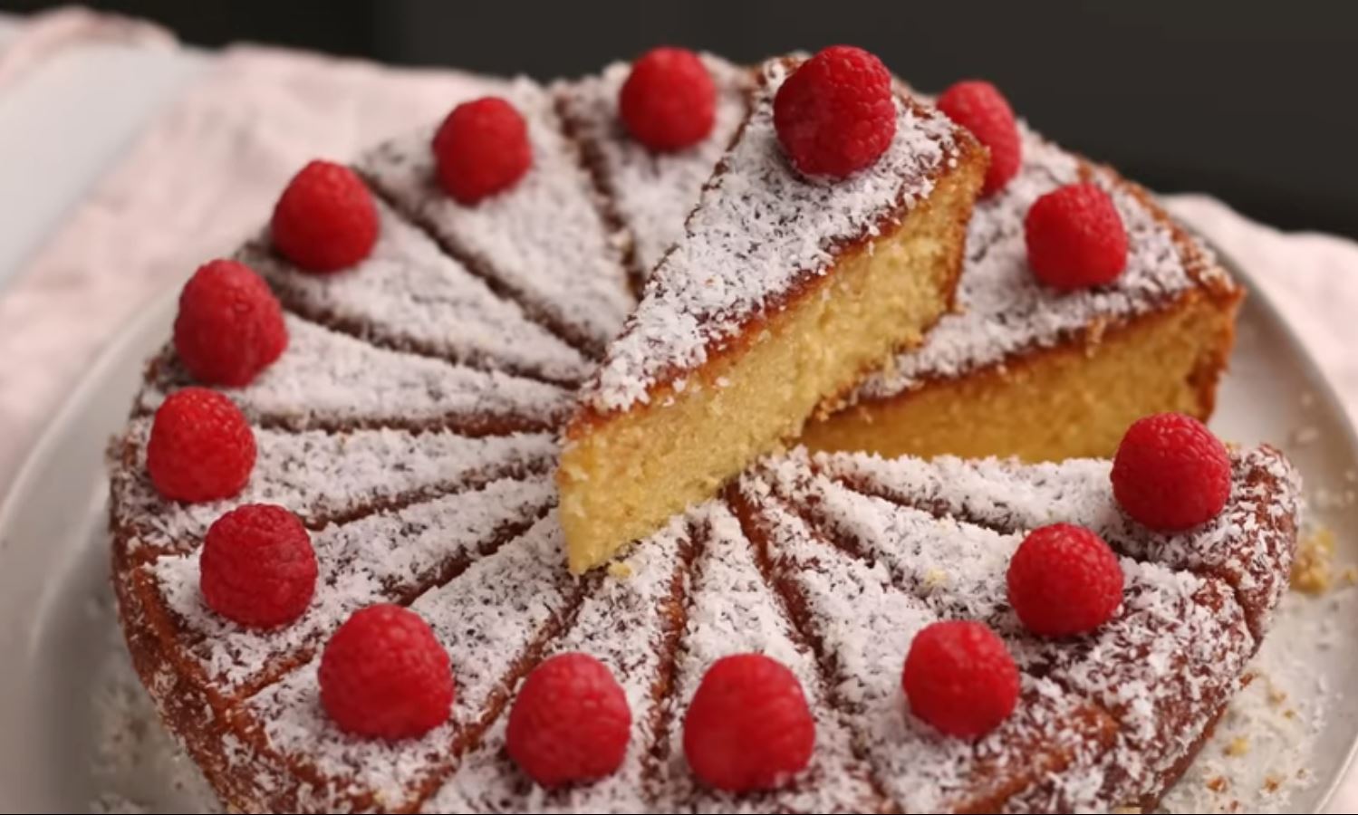 Πασπαλίζουμε με τριμμένη καρύδα και το κόβουμε σε 8 ή 16 κομμάτια και διακοσμούμε με