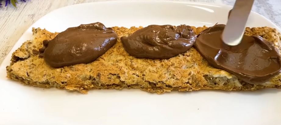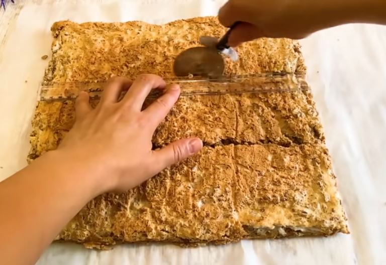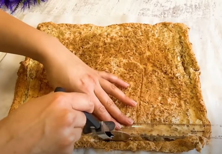 Βγάζουμε απο το φούρνο αφαιρούμε το χαρτί το τετραγωνίζουμε κόβοντας τα περισσέματα γύρω γύρω και αφήνουνε στην άκρη. Μετα το κόβουμε σε 3 ισες παράλληλες λωρίδες.