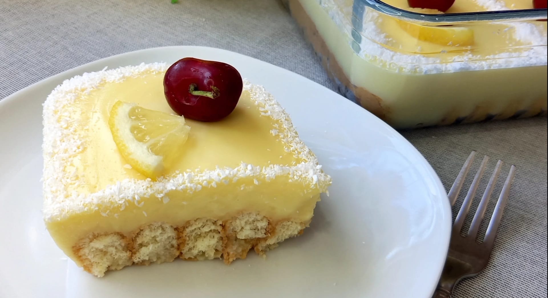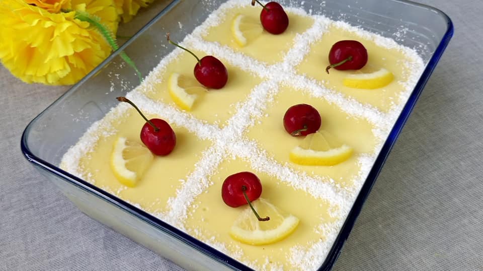 Οταν τη βγάλουμε διακοσμούμε με τριμμένη καρύδα φέτες λεμονιού και κεράσι και το γλυκό μας είναι έτοιμο
