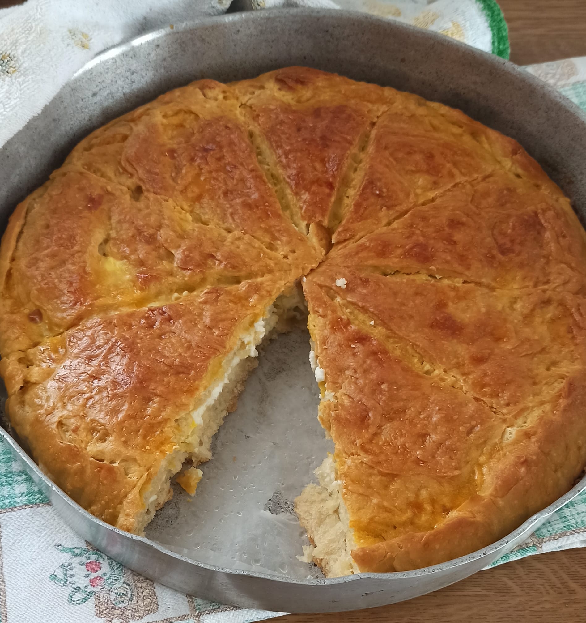 5. Θρυμματίζω τη φέτα και τη ρίχνω πάνω στο πρώτο κομμάτι ζύμης, καλύπτοντας όλη την επιφάνεια. ανοίγω και το δεύτερο κομμάτι ζύμης, το παίρνω και το τοποθετώ προσεκτικά πάνω από τη φέτα.