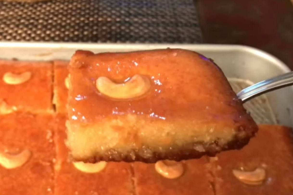 Βγάζουμε το σιρόπι από τη φωτιά και αμέσως αδειαζουμε το σιρόπι πάνω από το κέικ και το αφήνουμε 1 ώρα να απορροφήσει το σιρόπι. Κόβουμε σε κομμάτια και σερβίρουμε.