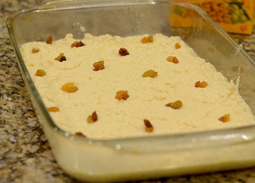 Πάρτε ένα μαχαίρι και κάντε διαγώνιες γραμμές από αριστερά προς τα δεξιά και ολοκληρώστε για να φτιάξετε σχήματα ρομβου. Τοποθετήστε τις σταφίδες στο κέντρο κάθε κομματιου.