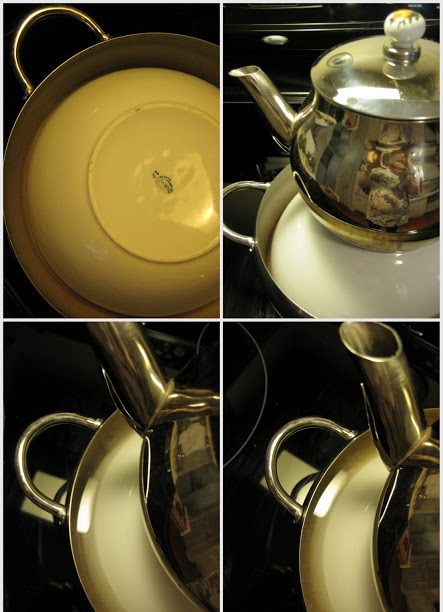 -Βάλε την κατσαρόλα πάνω από το μπολ. Ασφαλίζοντας με τα χέρια σας την κατσαρόλα με το μπολ αναποδογυρίστε ώστε το μπολ να κάτσει ανάποδα πάνω στην κατσαρόλα