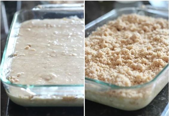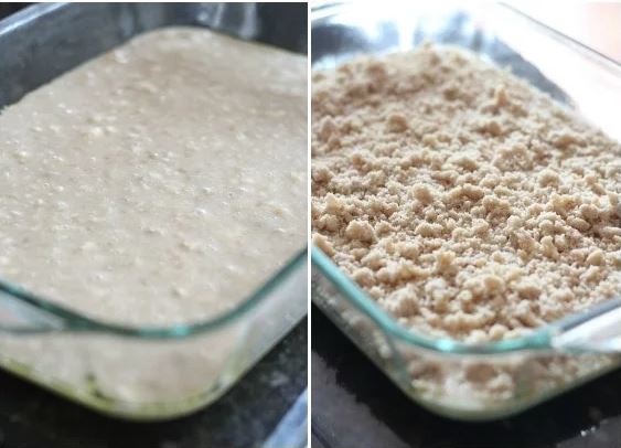 Ρίξτε το 1/2 του μείγματος μέσα στο προετοιμασμένο ταψάκι. Ρίξτε από πάνω το 1/3 του μείγματος με τα ψίχουλα.
