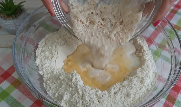 Σ ενα μπολ κοσκινίστε και αναμείξτε το αλεύρι , αλάτι, γιαούρτι, λάδι το μειγμα (2 ασπραδια + 1 κρόκο ) γάλα και ρίξτε την μαγια.