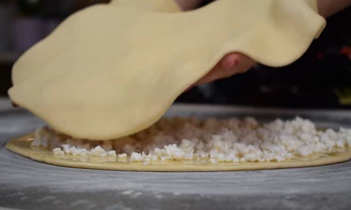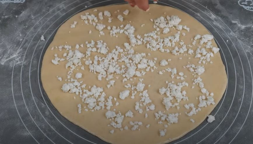 Παίρνουμε το πρώτο φύλλο το ανοίγουμε και βουτυρώνουμε και πασπαλίζουμε με την τριμμένη φέτα.