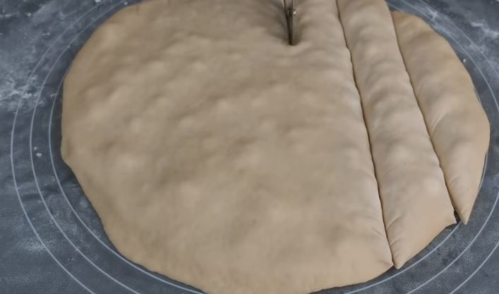 Το ξαναβγαζουμε σε αλευρωμένο παγκο και το ζυμώνουμε πάλι. Το χωρίζουμε σε 4 ισα μερη και φτιάχνουμε 4 μπαλες.