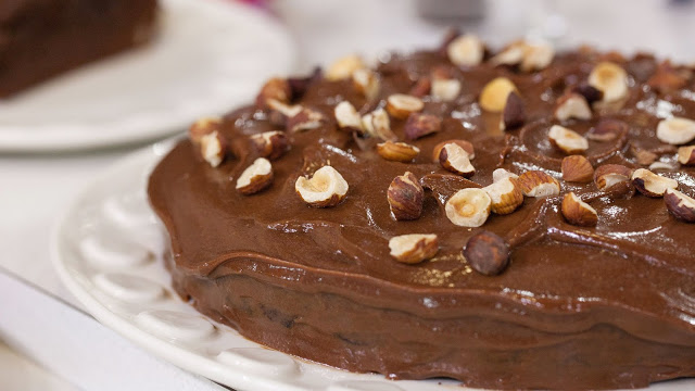 - Ανακατεύετε 200 γρ. μασκαρπόνε με τα 200 γρ. Nutella μέχρι να ομογενοποιηθούν και βάζετε το μείγμα στο ψυγείο για μια ώρα. Στη συνέχεια το απλώνετε πάνω στο κέικ μας. Αν θέλετε, στο σερβίρισμα, πασπαλίζετε με άχνη ζάχαρη ή σπασμένο φουντούκι.