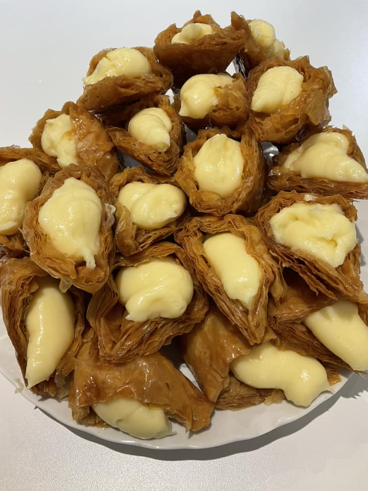 Απλώνουμε στον πάγκο μας ένα φύλλο και το αλείφουμε με βούτυρο, το διπλώνουμε στη μέση και το αλείφουμε πάλι με βούτυρο, το διπλώνουμε άλλη μια φορά το αλείφουμε με βούτυρο και το διπλώνουμε σε τρίγωνα όπως κάνουμε στα τυροπιτάκια.