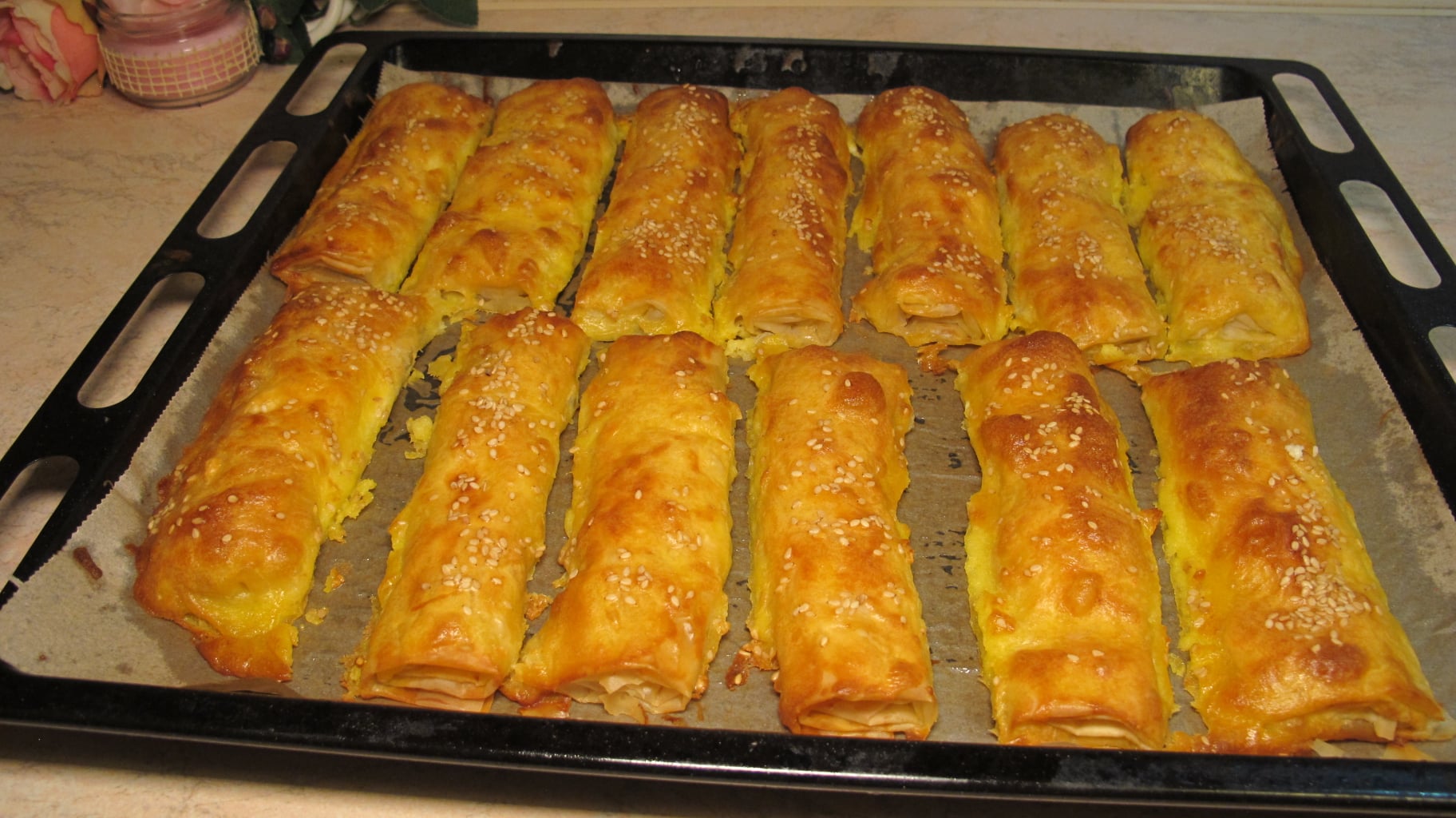 Συνεχίζω μεχρι εξαντλήσεως των φύλλων και τα βάζουμε σε ένα ταψακι στην αρχή. Μετα τα περιχύνουμε απο πάνω με όλο σχεδόν το υπόλοιπο μείγμα τα μπουρέκια.
