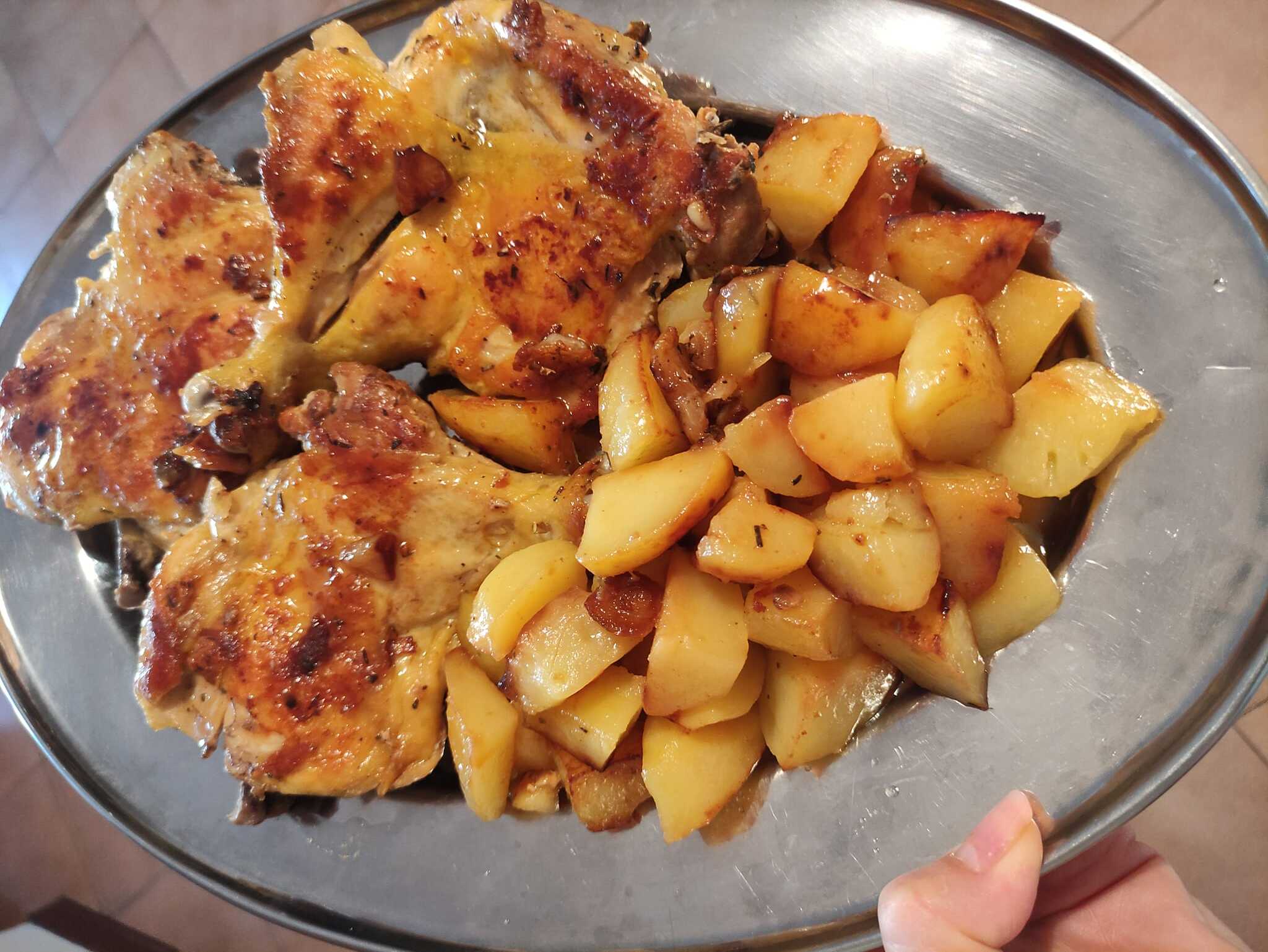 Προσθέστε τις πατάτες στο τηγάνι γύρω από το κοτόπουλο. Αλατοπιπερώστε τις πατάτες.