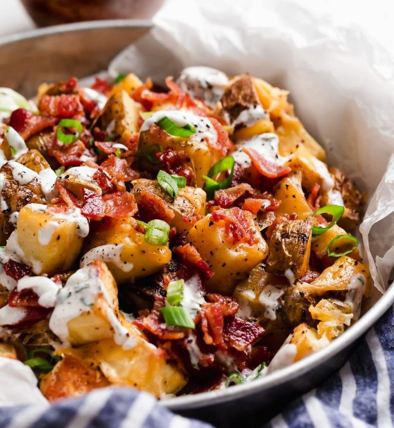 Αφαιρέστε από το φούρνο και γαρνίρετε με το dressing, το μπέικον και πράσινα κρεμμύδια. Σερβίρετε αμέσως.