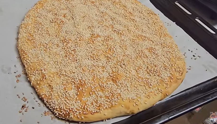 Κάνετε τα χαρακτηριστικά βαθουλώματα με τα δάχτυλα χρησιμοποιώντας πάλι λίγο λάδι από το ταχίνι στα χέρια σας. Αλείφετε την επιφάνεια με το μείγμα νερού και μελιού και πασπαλίζετε με μπόλικο σουσάμι. Ψήνετε σε προθερμασμένο φούρνο στους 200°C για 20 με 25 λεπτά μέχρι να πάρει ένα ωραίο χρυσαφένιο χρώμα.