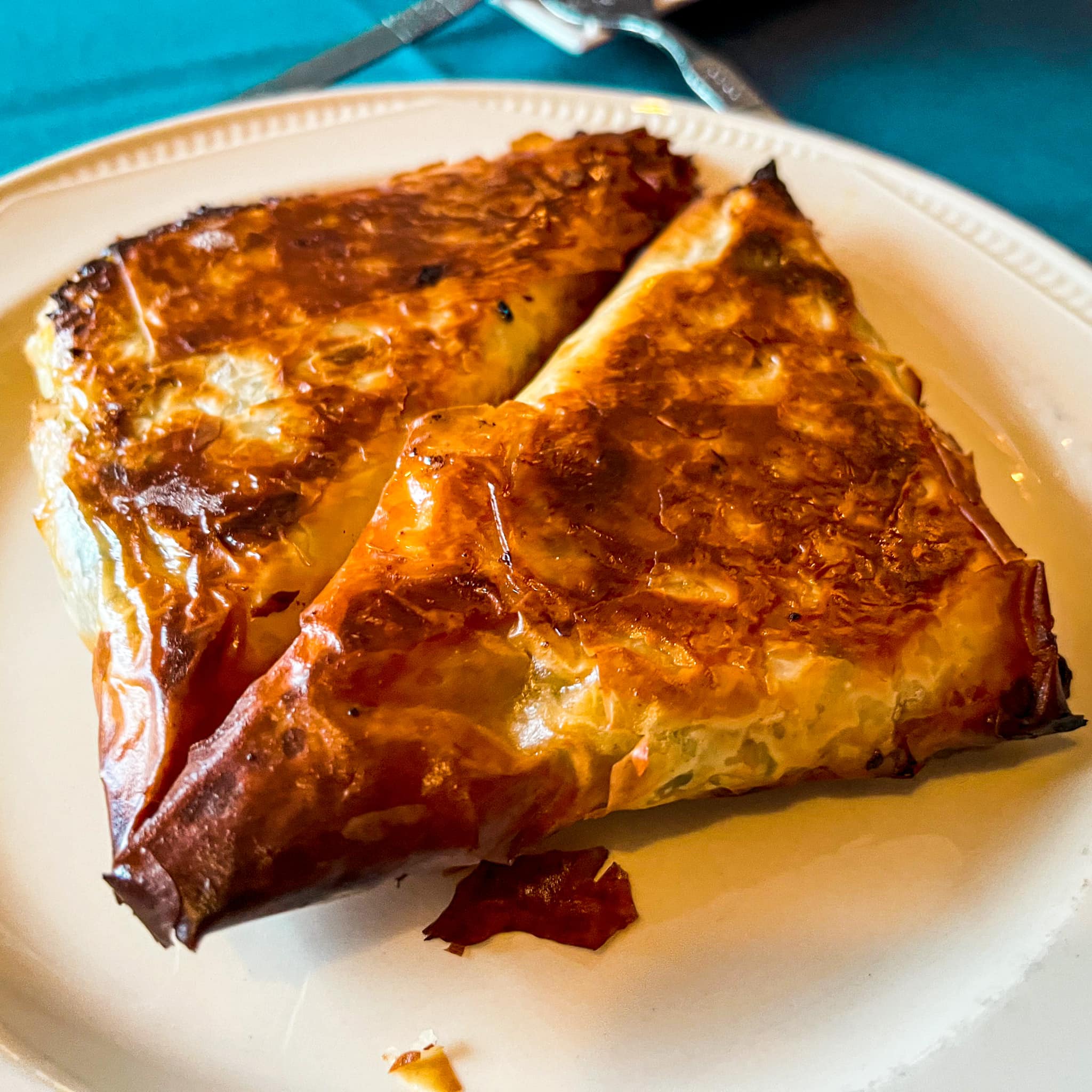 Διπλώνουμε τη γωνία της ζύμης πάνω από τη γέμιση σπανακιού και σχηματίζουμε ένα τρίγωνο. Συνεχίστε να διπλώνετε, διατηρώντας το σχήμα του τριγώνου, χρησιμοποιώντας ολόκληρη τη λωρίδα. Επαναλάβετε για να χρησιμοποιήσετε το υπόλοιπο μείγμα.