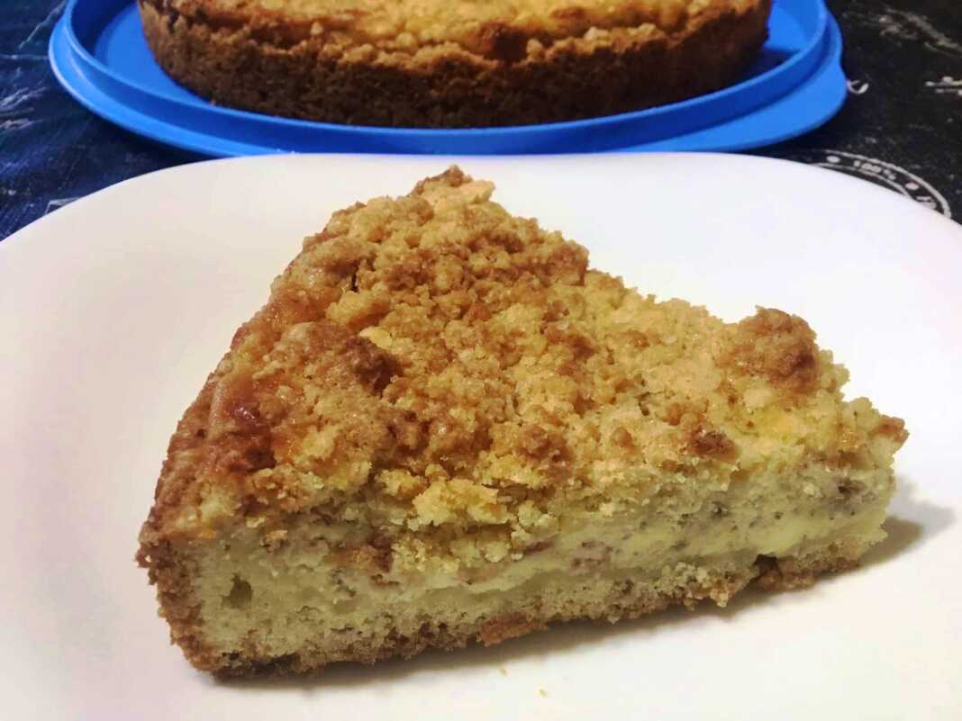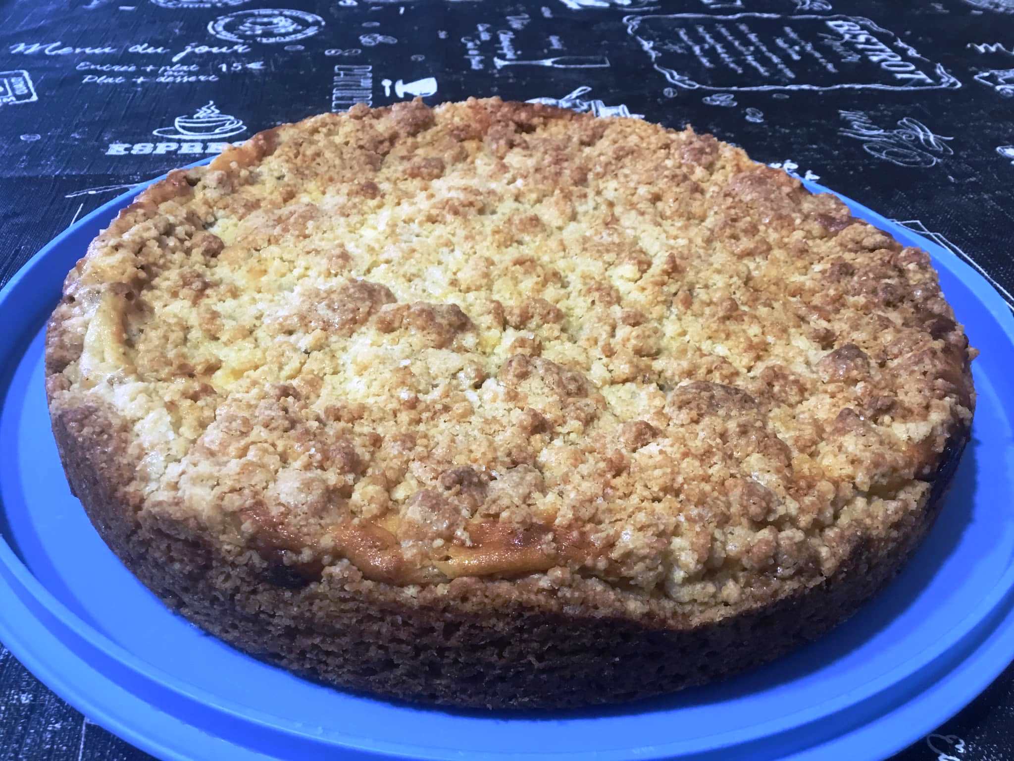 Σκεπάζουμε με την υπόλοιπη τριμμένη ζύμη, μοιράζοντας τη σε όλη τη γέμιση χωρίς να αφήσουμε τρύπες.