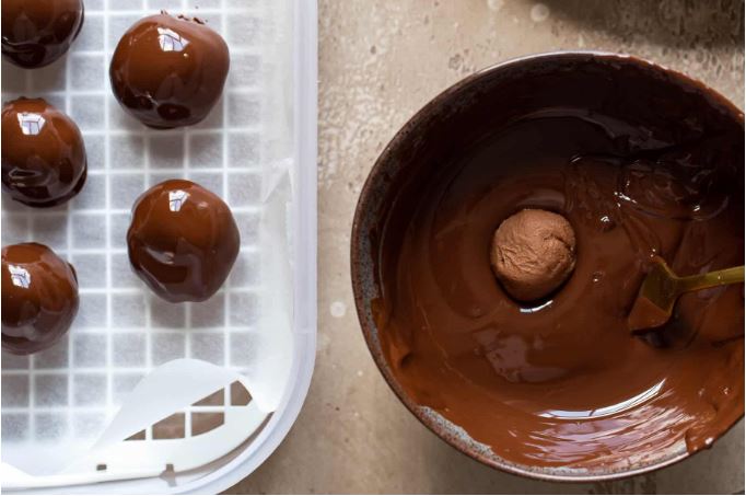 Βυθίστε τις τρούφες σε λιωμένη σοκολάτα και αφήστε το να στεγνώσει στο ψυγείο για περίπου