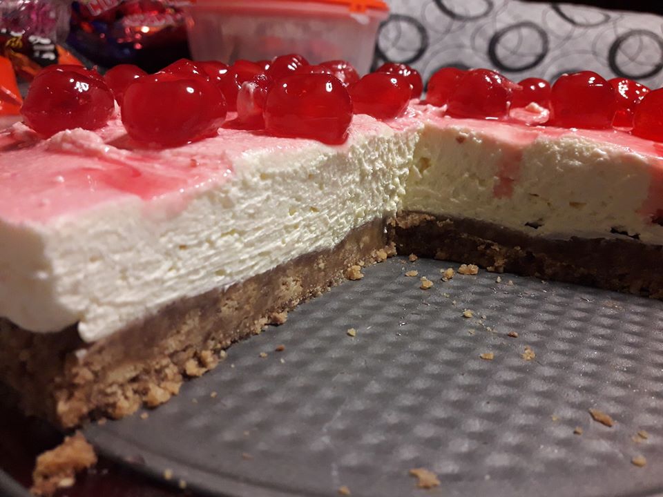 Στρώνουμε τα μπισκότα σε τσέρκι,26 είναι το δικό μου,και από πάνω την κρέμα και μετά ψυγείο να παγώσει λίγο.Μετά στρώνουμε την μαρμελάδα ή ότι τύχει να βάλουμε και ξανά ψυγείο να παγώσει καλά
