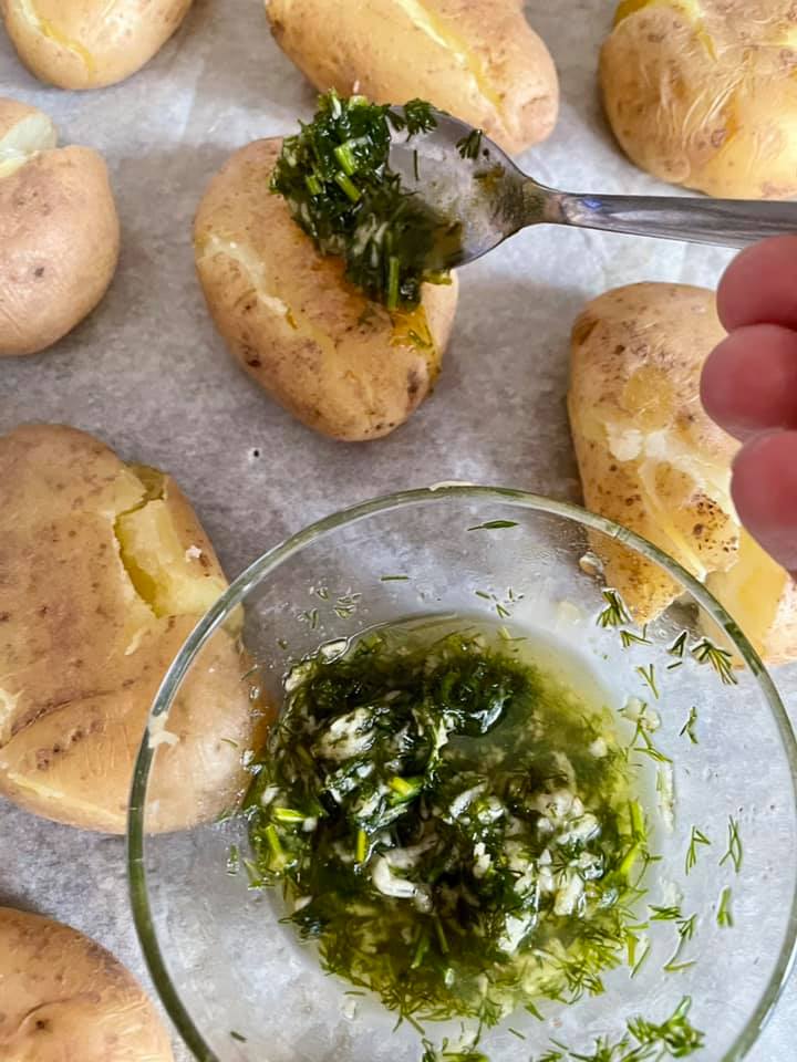1/ Λιωνουμε το σκόρδο, αλατίζουμε – αλευρώνουμε, ρίχνουμε το λιωμένο βούτυρο, περιχύνουμε τις πατάτες, ψήνουμε και όταν είναι έτοιμο πασπαλίζουμε με αρωματικά χόρτα.