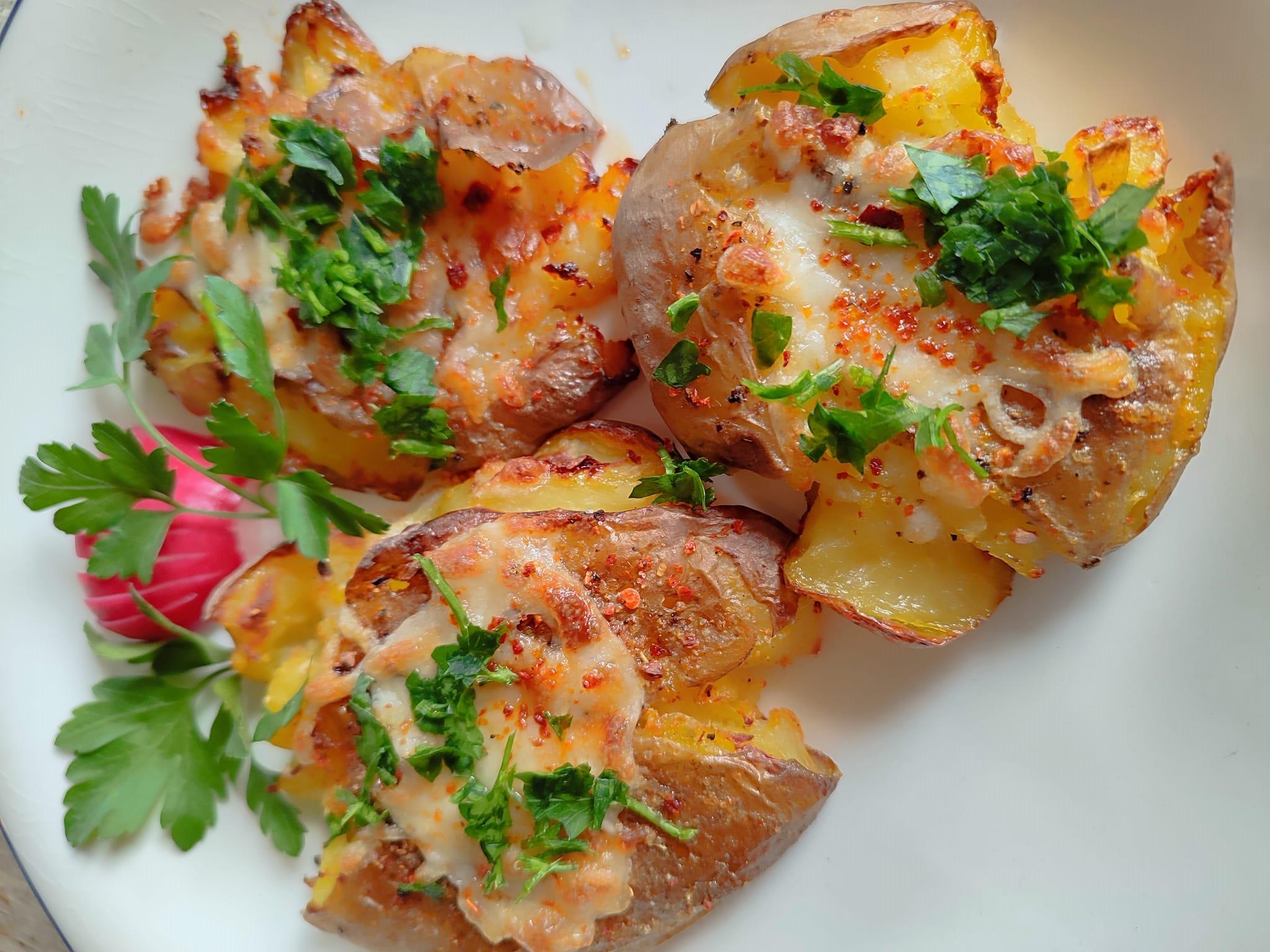 Έβρασα τις πατάτες, μετά τις έβαλα σε ένα ταψί στρωμένο με χαρτί ψησίματος, τις ίσιωσα με ένα φλιτζάνι, τις τρύπησα με ένα πιρούνι και πασπαλίσαμε με αλάτι και αγαπημένα μπαχαρικά και έβαλα βούτυρο σε κάθε μια. Έψησα στο φούρνο μέχρι να ροδίσουν καλά. Μετά πασπάλισα με μοτσαρέλα και έψησα μέχρι να γίνει. Στο σερβίρισμα πασπαλίζω με νιφάδες κόκκινης πιπεριάς και μαϊντανό. Φτιάχνουν ένα υπέροχο συνοδευτικό ή τρώγονται μόνες τους.