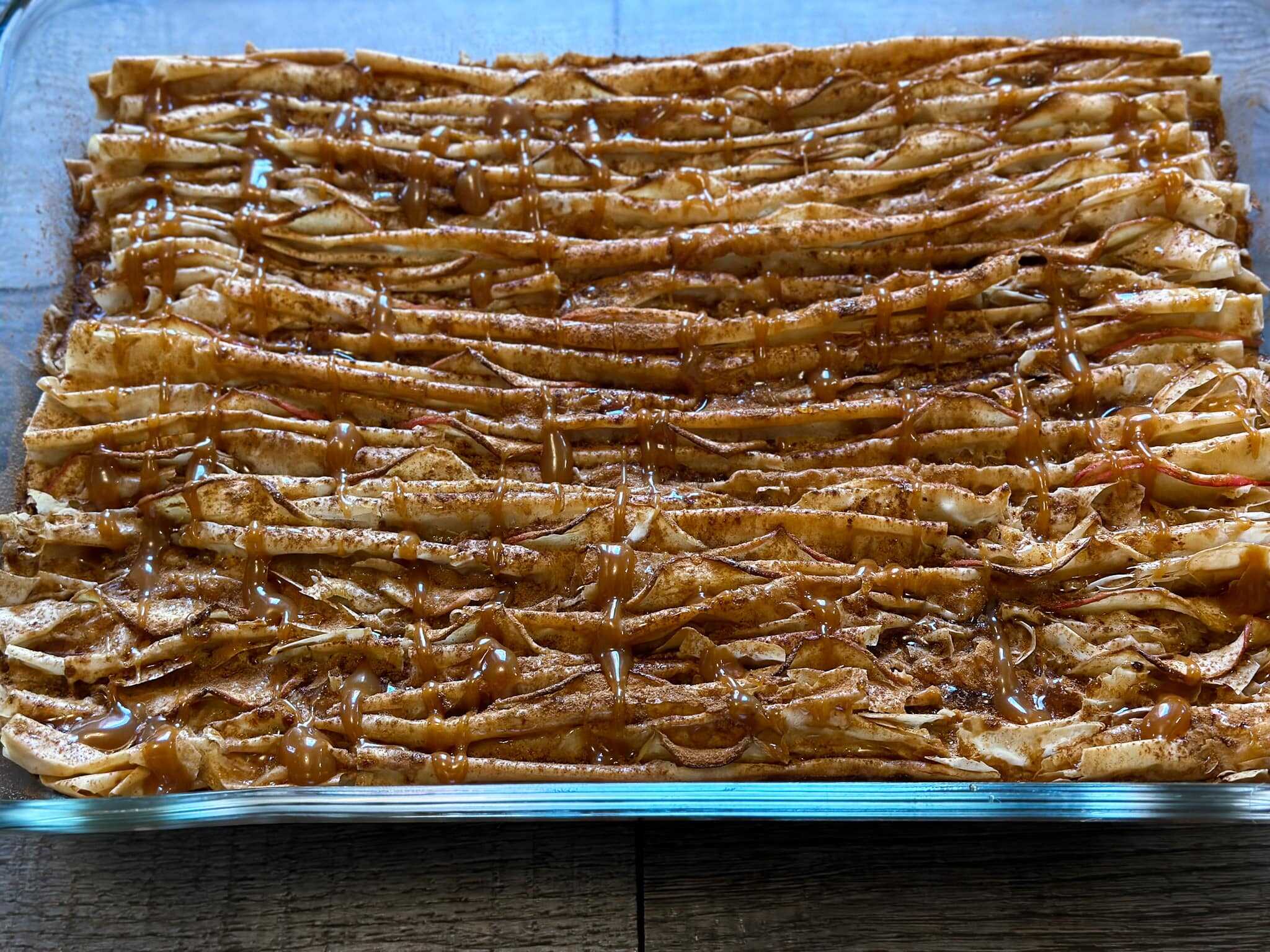 Προσθέστε γαρνιτούρες τις επιλογής σας εγω εφτιαξα λίγη καραμέλα. Αφήστε το να κρυώσει για 15-20 λεπτά. Κόψτε σε φέτες και απολαύστε το όσο είναι χλιαρό.