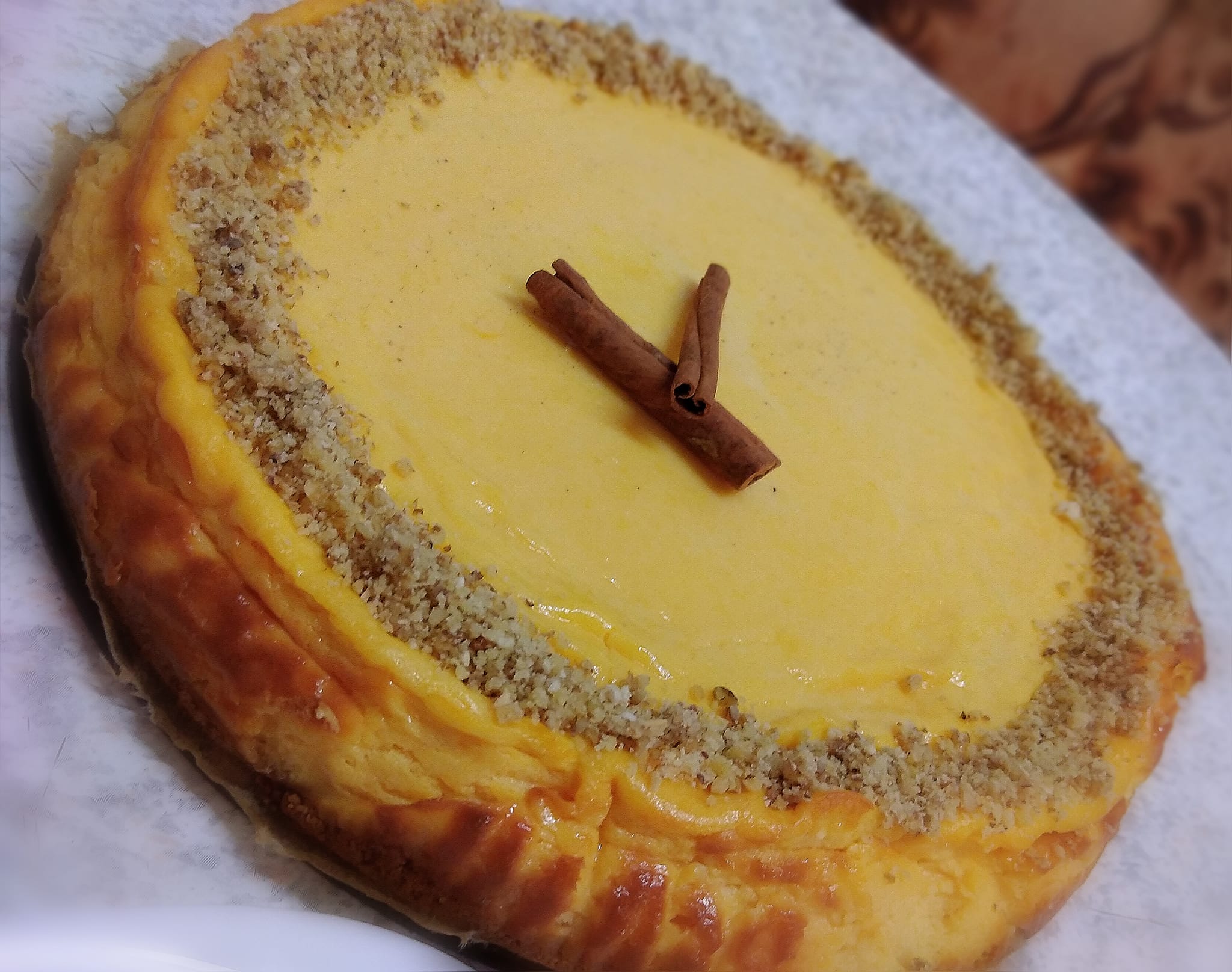 Ψήνουμε το cheesecake κολοκύθας σε προθερμασμένο φούρνο στους 150 βαθμούς για 90 λεπτά.