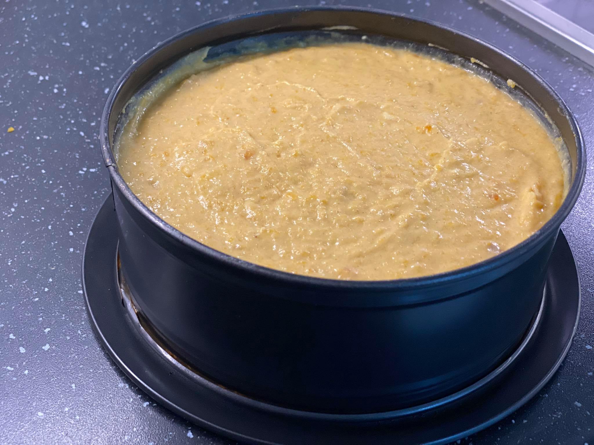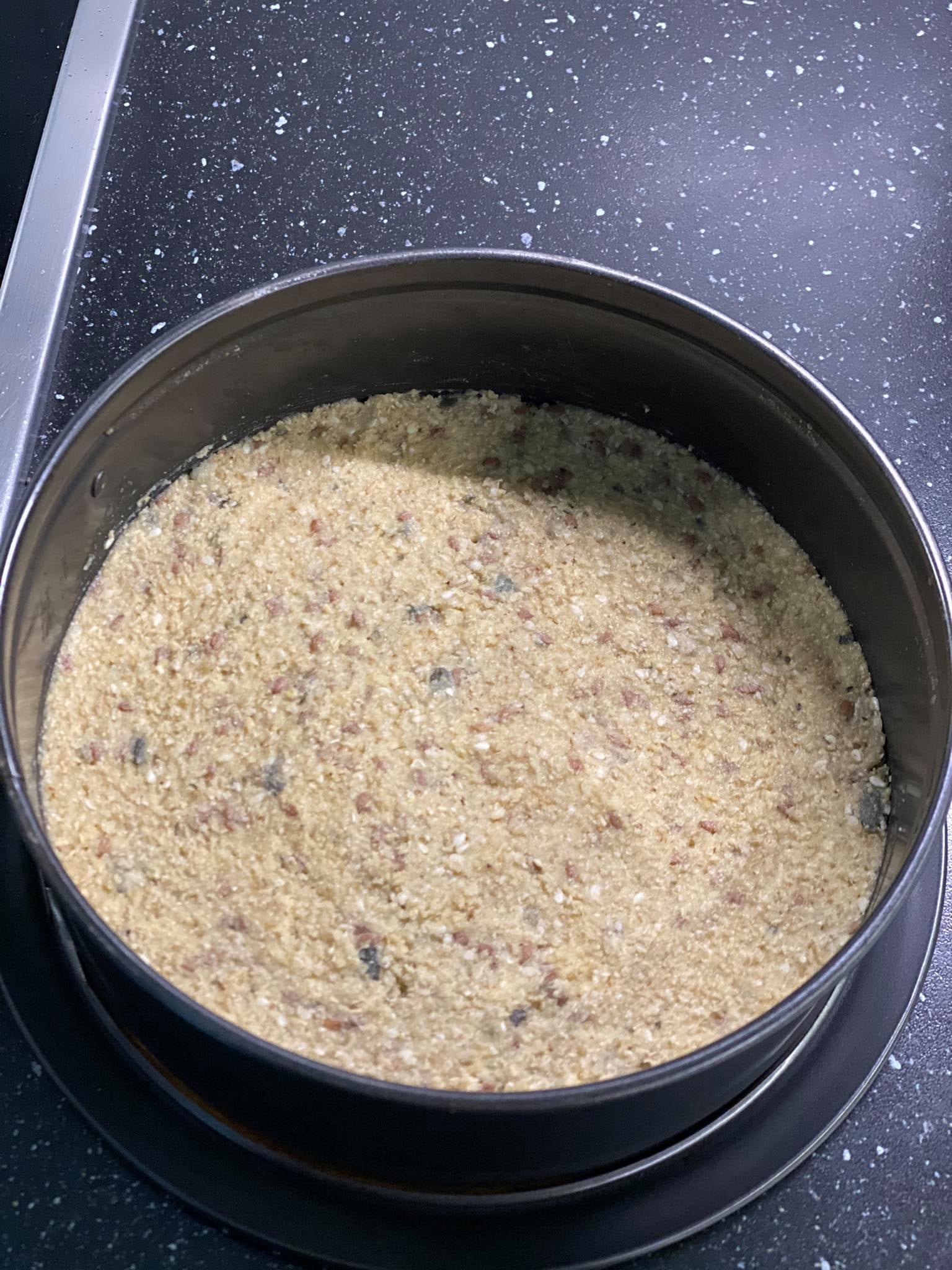 Από όλα τα πρώτα ετοιμάζουμε τη βάση του cheesecake. Συνήθως παιρνω τον μπλεντερ και ανακατεύω εκεί τα υλικά. Το απλώνω σε ένα μικρό ταψί με πάτο που βγαινει (18 εκ.) και το βάζω στο ψυγείο να σφίξει.