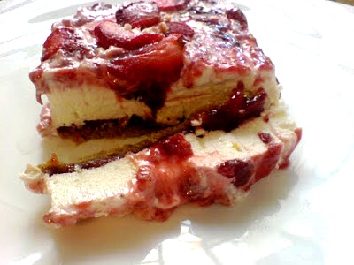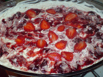 Τέλος γαρνίρομαι με 6-7 κουταλιές μαρμελάδα φράουλα και με ένα πιρούνι σχηματίζουμε ¨¨κύματα ¨¨στην επιφάνεια της κρέμας.