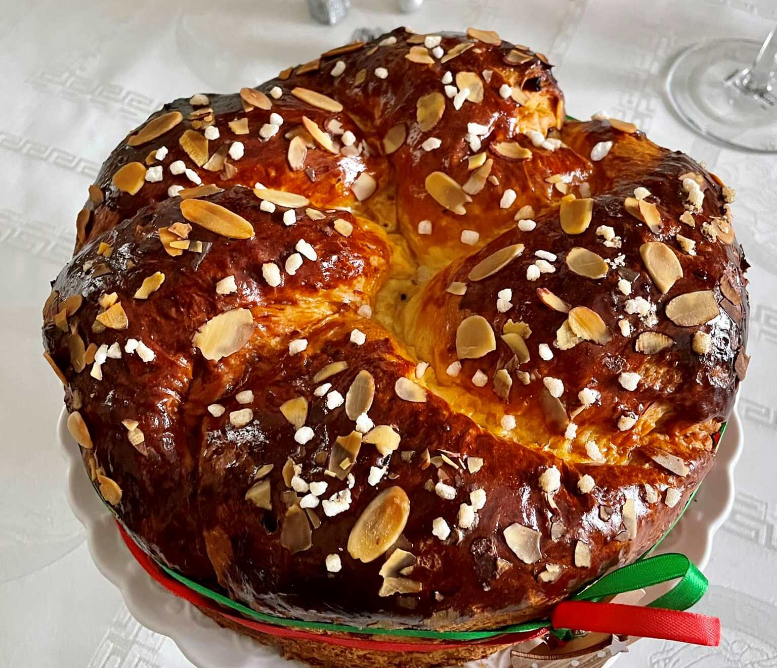5 λεπτά πριν το ψήσιμο, αλείφουμε με κρόκο + νερό, πασπαλίζουμε με αμύγδαλο αν θέλουμε ή ξηρούς καρπούς