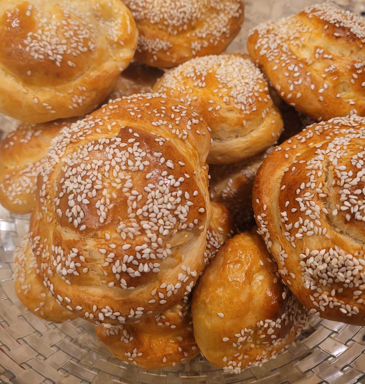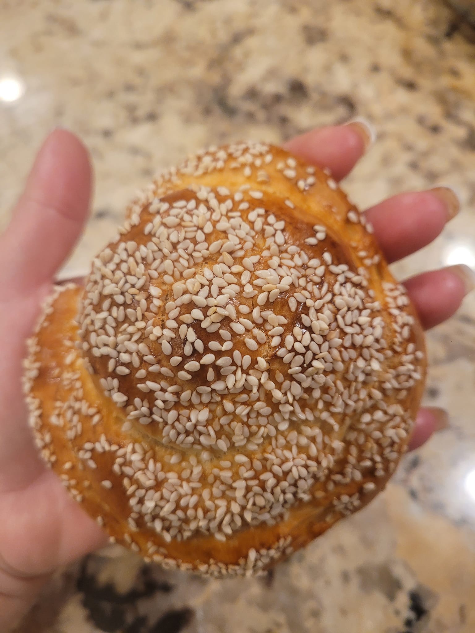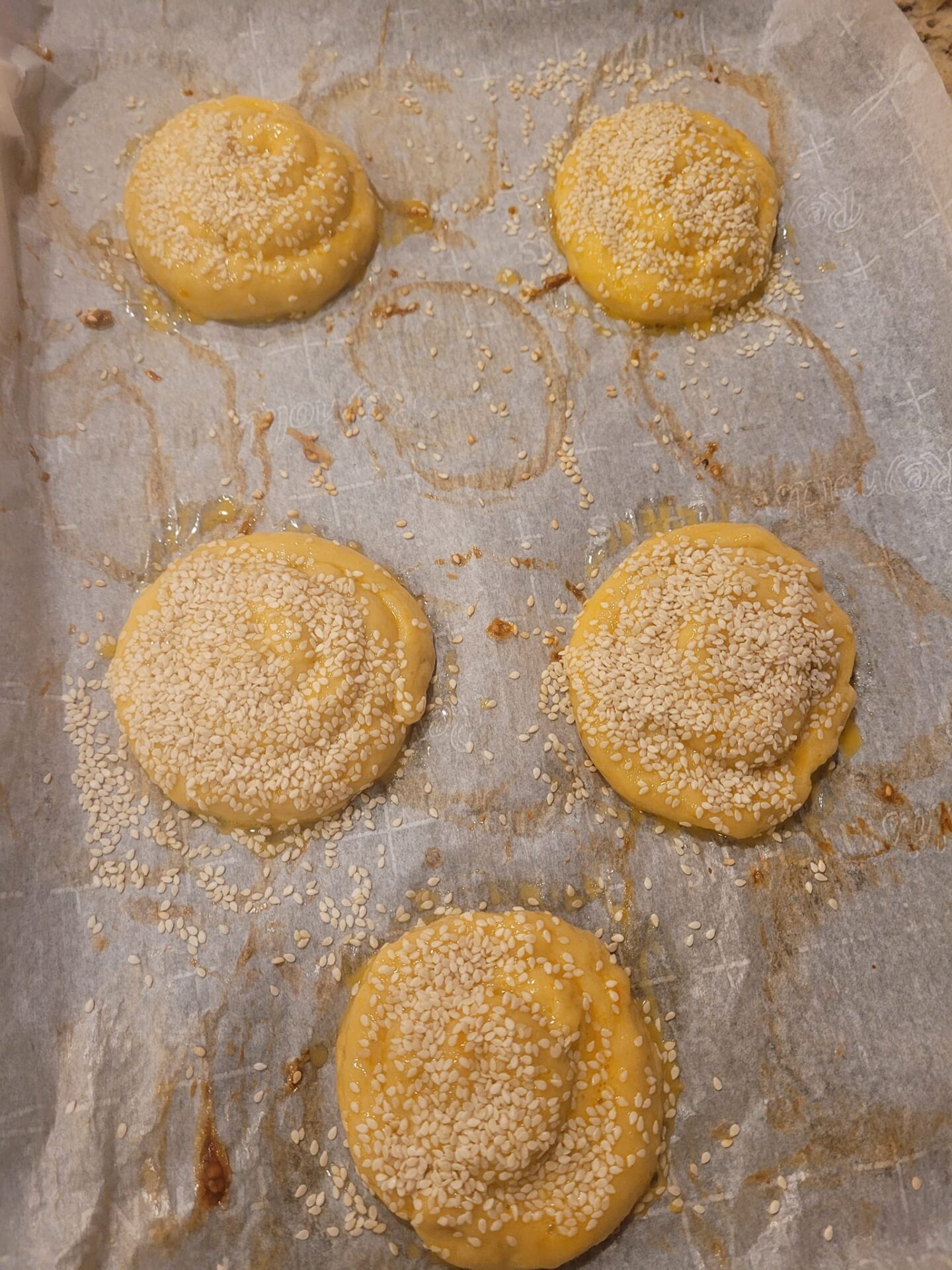 Κόψτε απο την ζύμη διαμορφώστε σε κορδονι και μετα σαλιγκάρι αλειψτε με ένα μείγμα αυγό με λίγο λαδι.
