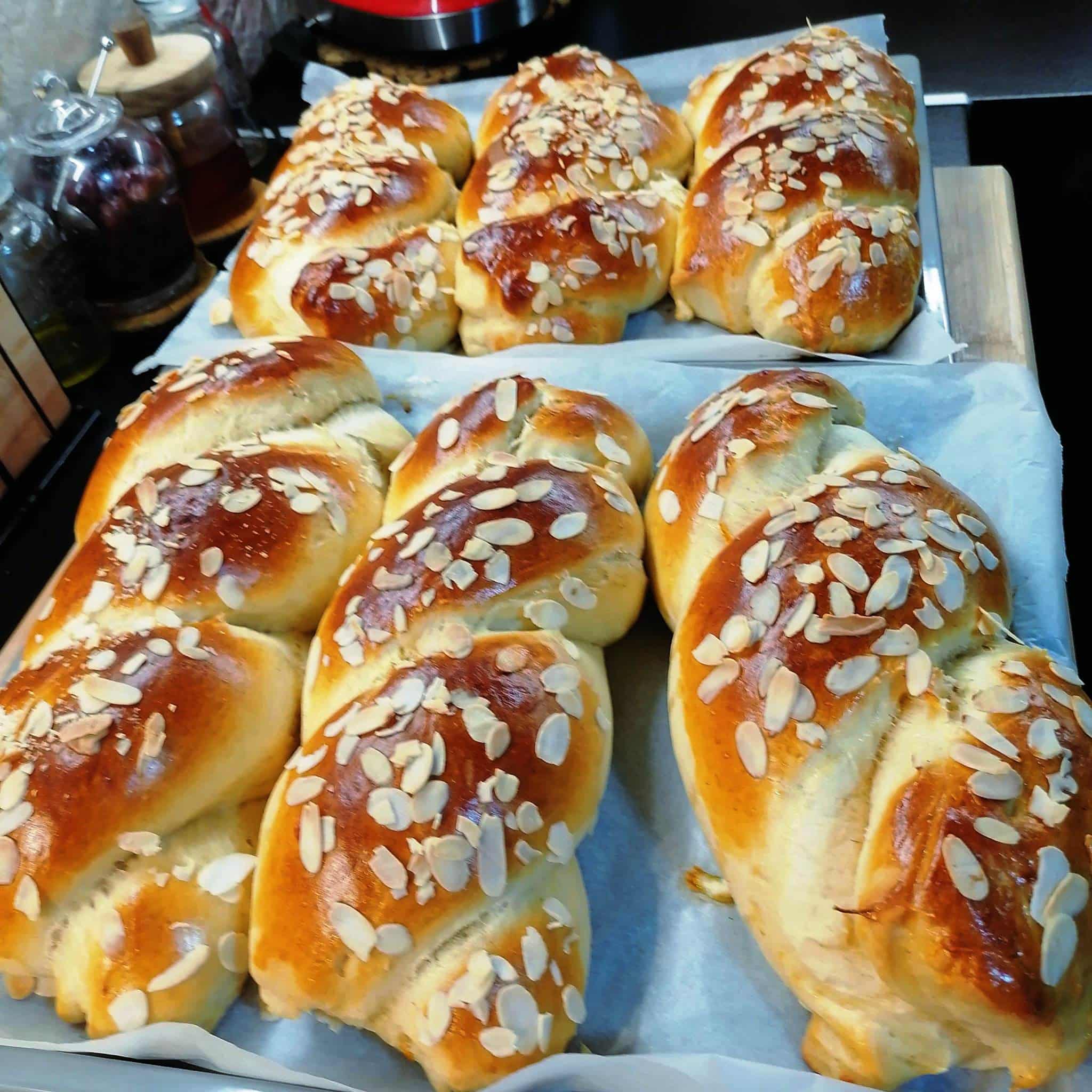 Κόβουμε την ζύμη σε κομμάτια ανάλογα πόσο τα θέλουμε, πλάθουμε πλεξούδες τις βάζουμε σε ταψιά με λαδόκολλα και αφήνουμε να φουσκώσουν.