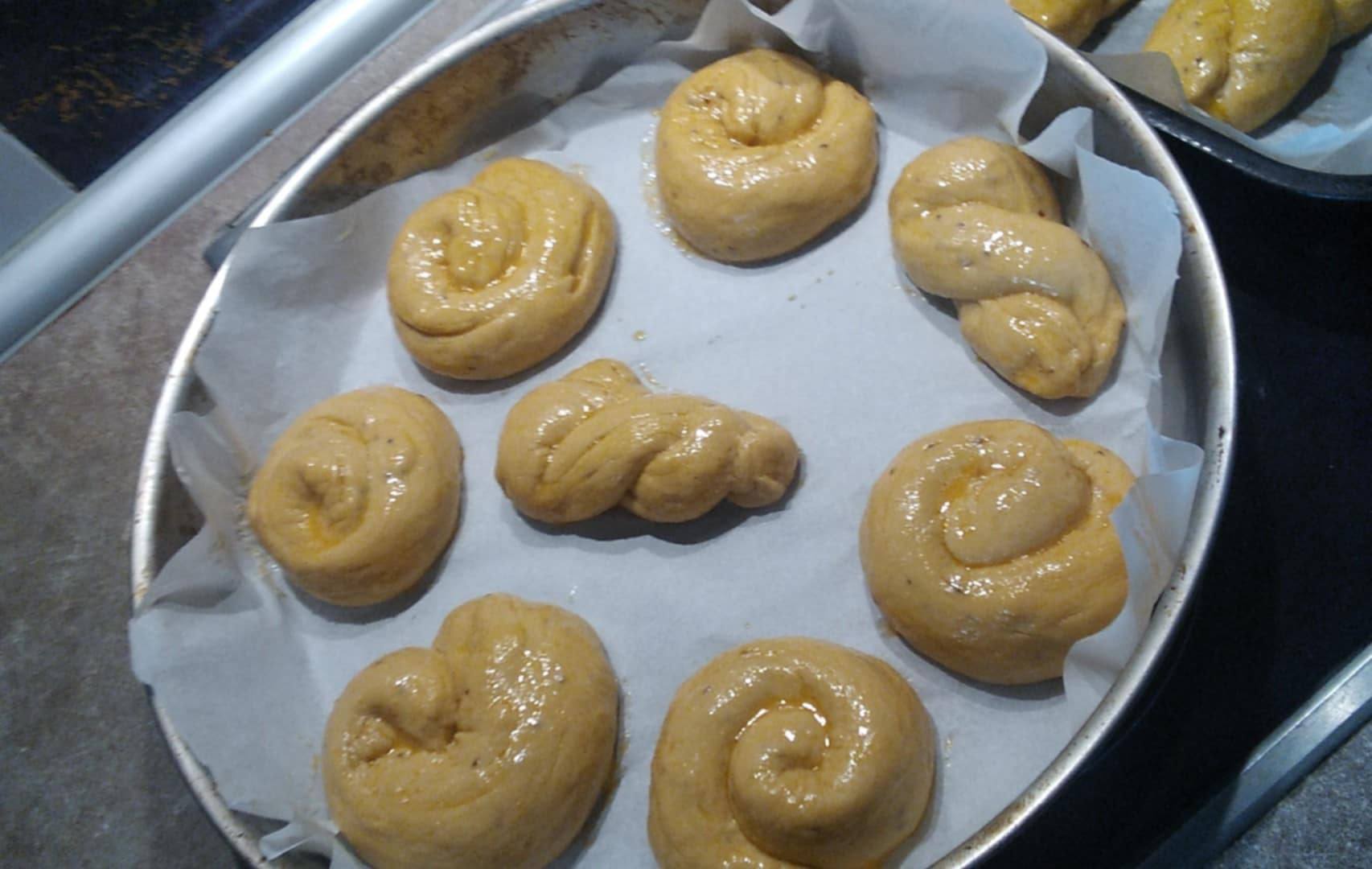 - Χωρίστε τη ζύμη σε μικρά κομμάτια και πλάστε τα σε όμορφα τσουρεκάκια στο σχήμα που επιθυμείτε (όπως φαίνονται στη φωτογραφία, σε σχήμα σαλιγκαριού ή πλεξούδας).