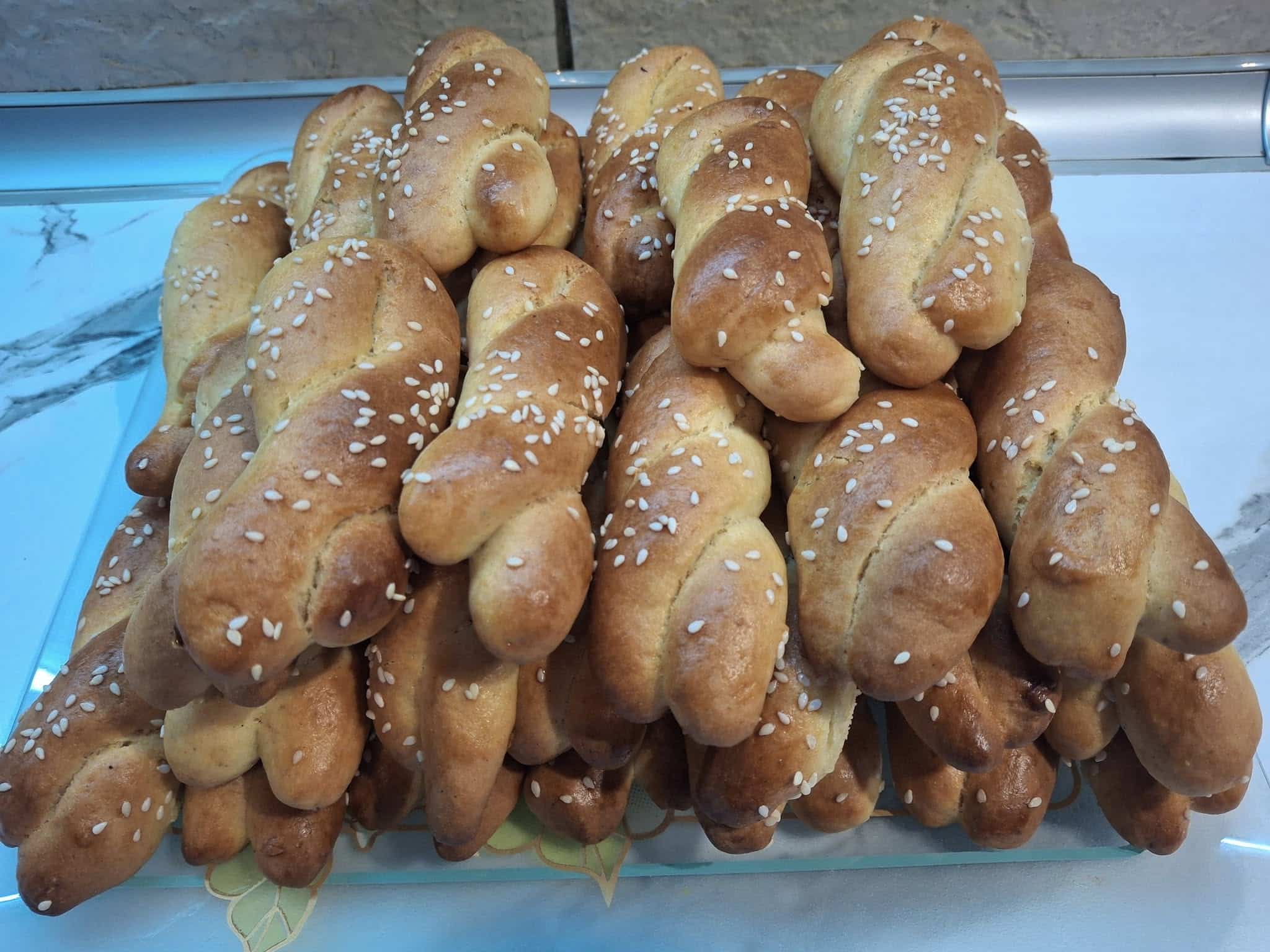 Πλαθουμε πλεξουδιτσες βάζουμε σε ταψί με λαδόκολλα με ένα πινέλο αλείφουμε με αυγο και γάλα ρίχνουμε σουσάμι.