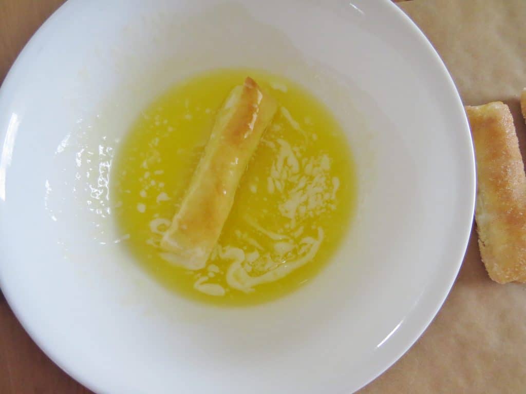 βυθίστε κάθε ψημένο τσουρος, ένα κάθε φορά, στο λιωμένο βούτυρο. Επαλείψτε όλες τις πλευρές, όχι να ποτίσουν.