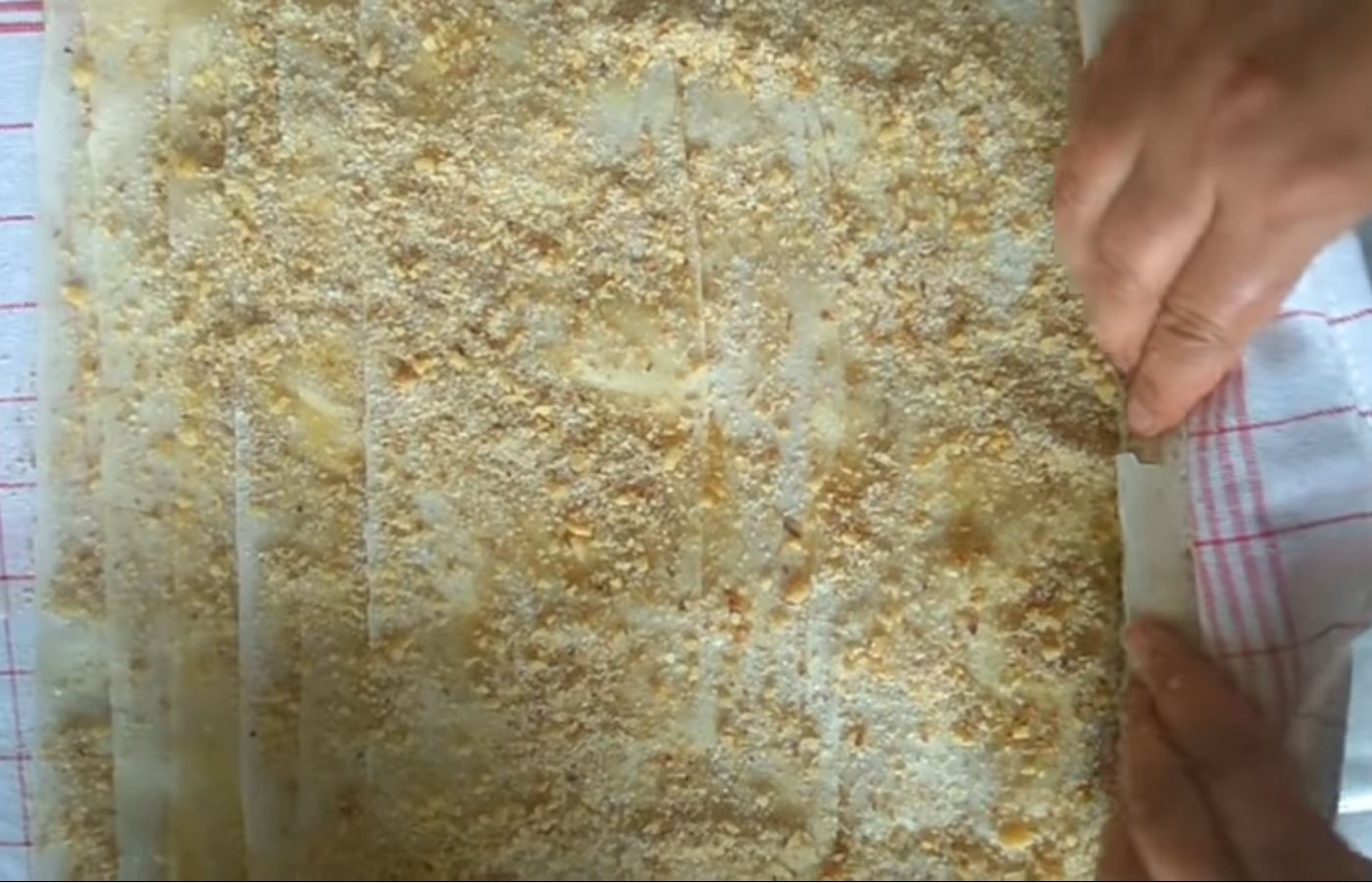 Δημιουργία Ρολών: Στρώνουμε πάνω σε μία μεγάλη, καθαρή πετσέτα το πρώτο φύλλο κρούστας. Το βουτυρώνουμε πολύ καλά με ένα πινέλο. Το καλύπτουμε με μια γενναιόδωρη ποσότητα από την γέμιση καρυδιού-ζάχαρης.