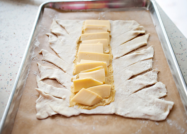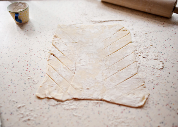 Βάλτε τη ζύμη σε μια καλά αλευρωμένη επιφάνεια. Βάλτε τη ζύμη σε ένα φύλλο ψησίματος και κάντε σχισμές στη ζύμη όπως βλέπετε παραπάνω για να κλείσετε τη ζύμη.