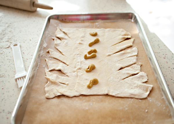 Βάλτε μουστάρδα στην μέση της ζύμης. Περίπου 2 κουταλιές της σούπας.