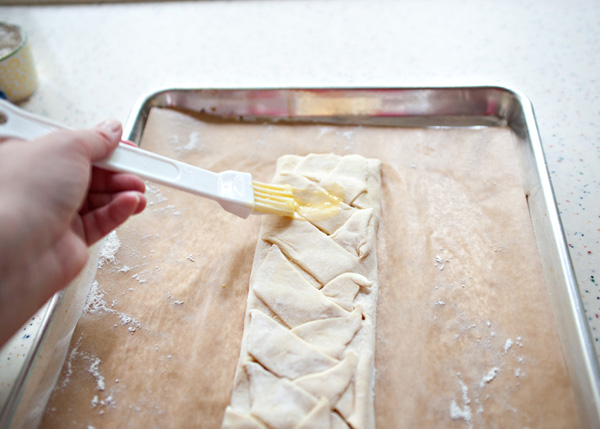 Βουρτσίστε με το υγρό αυγό πάνω από την πλεκτή ζύμη και σφραγίστε τις άκρες