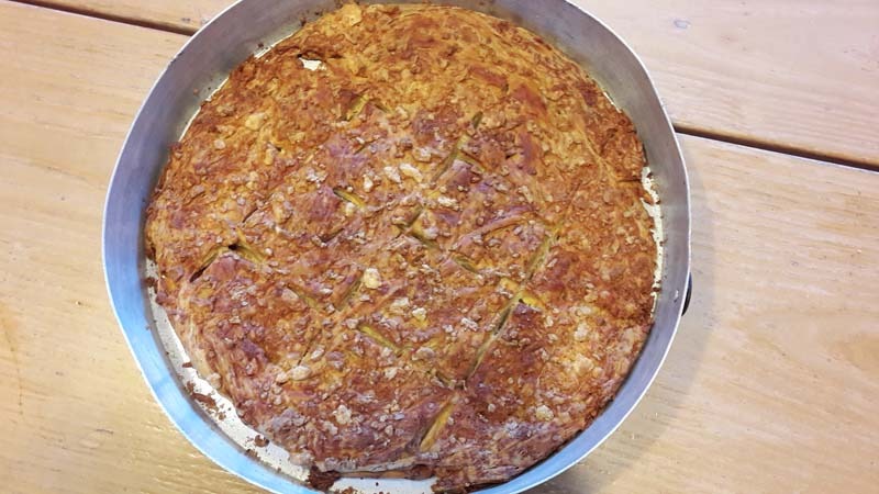 Πασπαλίζουμε από πάνω με την υπόλοιπη φέτα, ραντίζουμε με λάδι, χαράζουμε με ένα μαχαίρι και ψήνουμε σε προθερμασμένο φούρνο στους 180 C. Όταν ροδίσει η πίτα -μετά από τρία τέταρτα περίπου- την σκεπάζουμε με αλουμινόχαρτο και την αφήνουμε για ένα επιπλέον τέταρτο στο φούρνο, να στεγνώσει καλά – καλά.