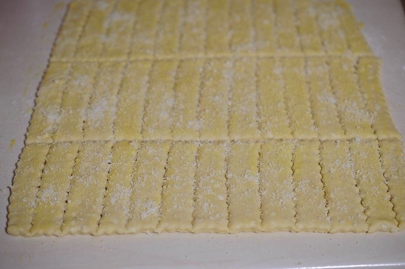 Η ζύμη απλώνεται σε ορθογώνιο φύλλο πάχους περίπου 0,5 εκατοστών. Τα τυροκριτσίνια κόβονται με οδοντωτό ρολό στο επιθυμητό μέγεθος.