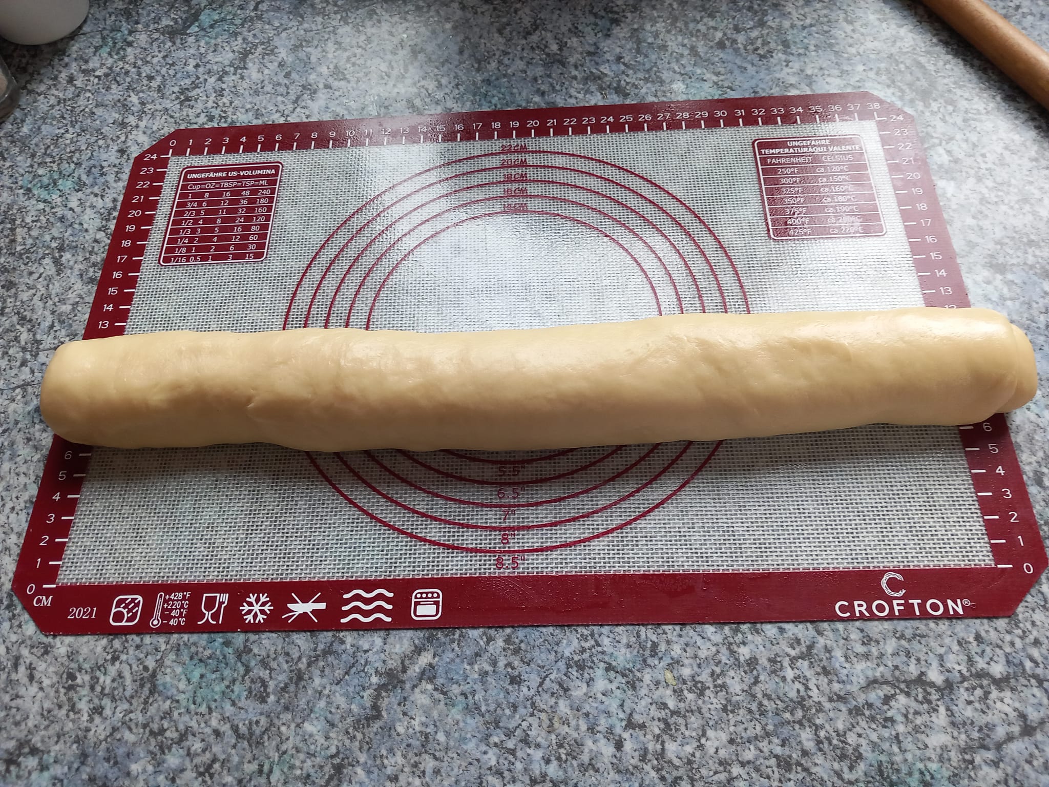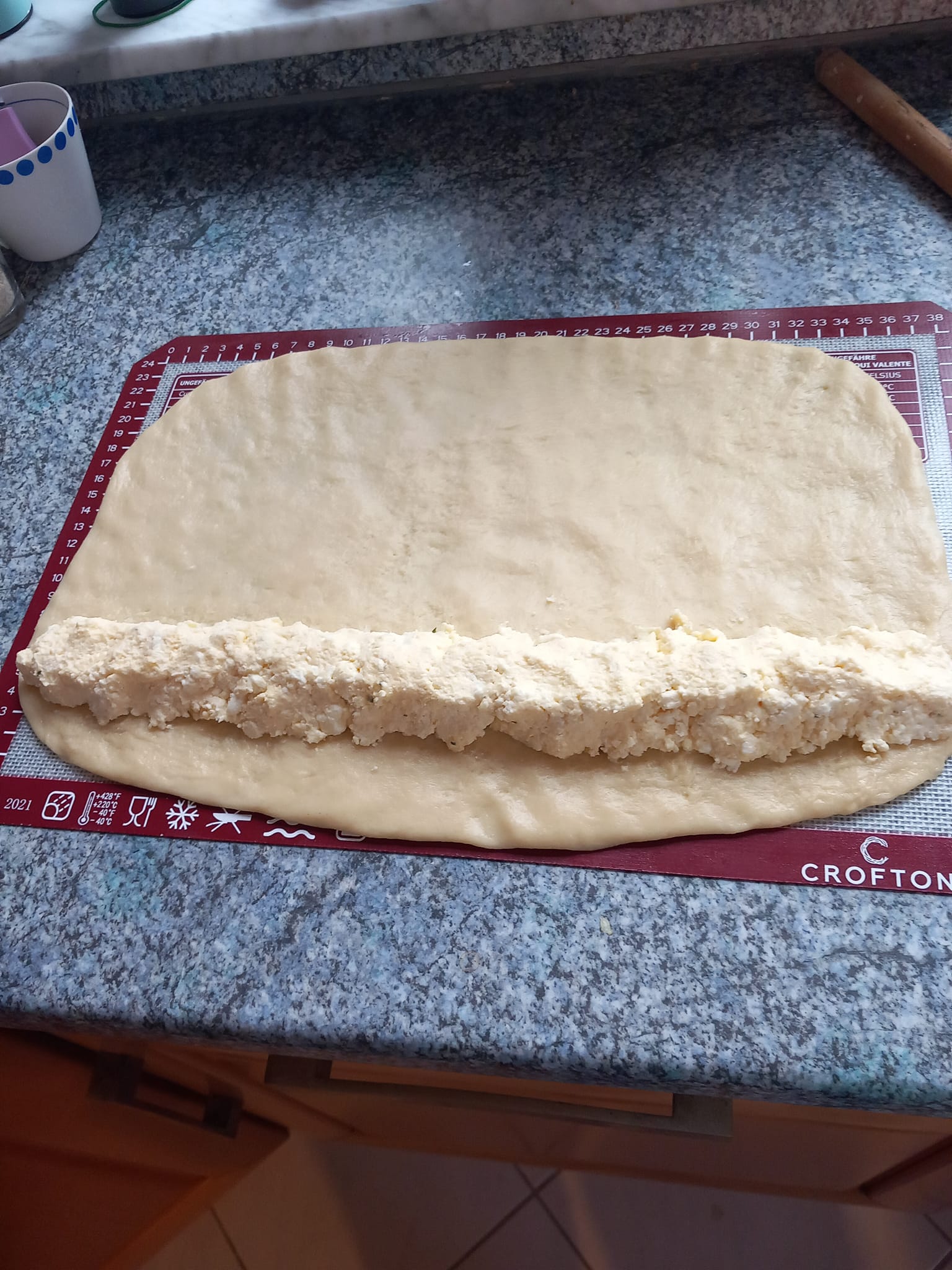 Μοιράζουμε την ζύμη στα δύο δηλαδή κάνουμε δύο φύλλα μακρόστενα βάζουμε το μείγμα