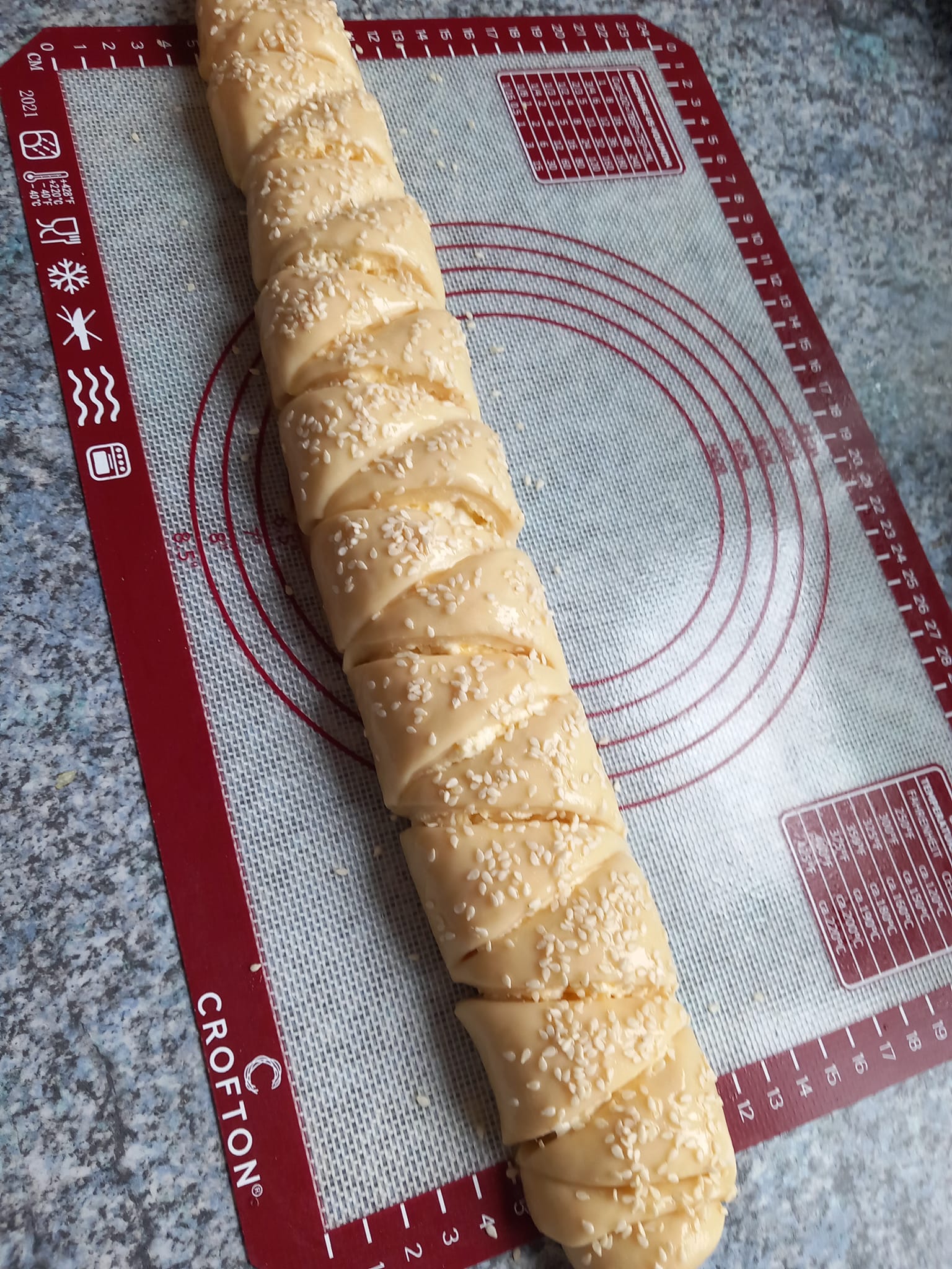 πατάμε λίγο και κόβουμε τριγωνακια αλειφουμε αυγό και σουσάμι