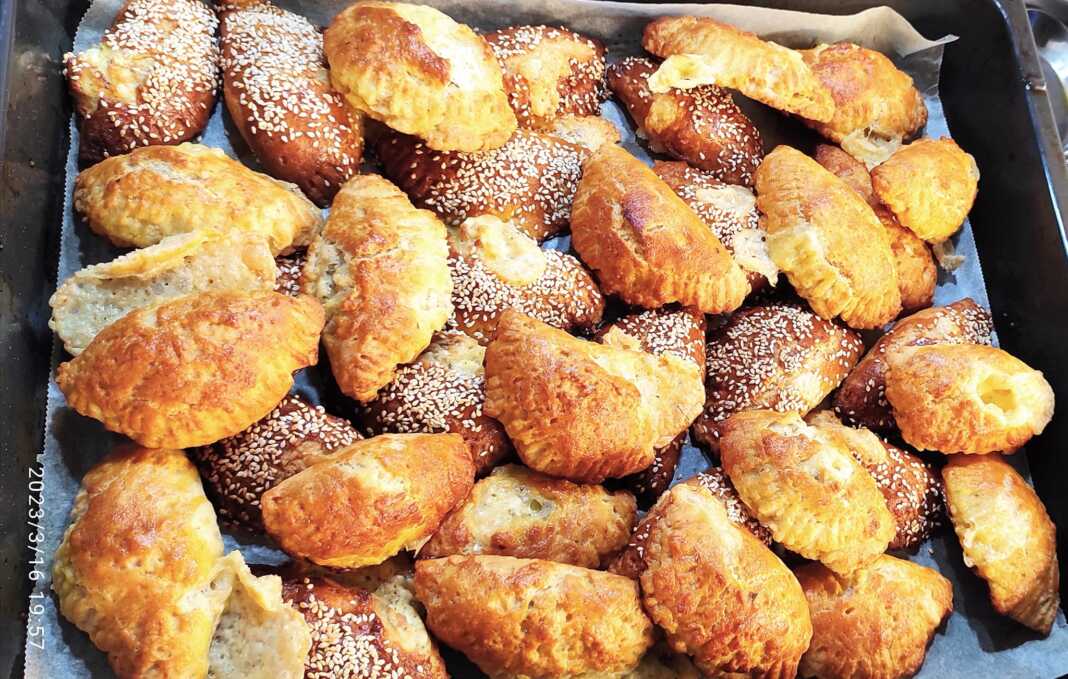 Παίρνουμε μια μικρή μπαλίτσα από την ζύμη στο μέγεθος που έχει το μπαλάκι του πίνγκ πονγκ την ανοίγουμε να πλατύνει ελαφρά και βάζουμε ένα κουταλάκι του γλυκού από την γέμιση που ετοιμάσαμε στην άκρη της ζύμης και σκεπάζουμε με την άλλη μισή να σχηματιστεί ένα μισοφέγγαρο.