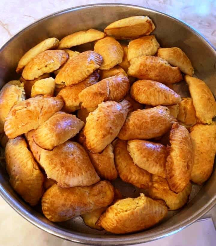 Στη συνέχεια, με ένα κουταλάκι του γλυκού προσθέστε το μείγμα τυριού στη μία πλευρά και με την άλλη πλευρά, γυρίστε το (μισοφέγγαρο) και πιέστε τα άκρα για να κλείσετε. Η μαμά μου χρησιμοποιεί ένα πιρούνι για το τέλος για να κάνει λίγο σχέδιο. Επαναλαμβάνω.