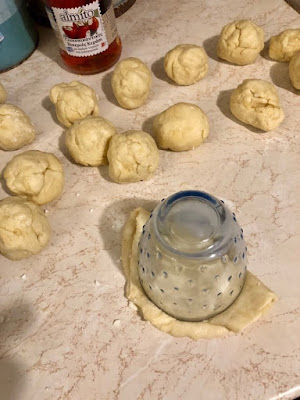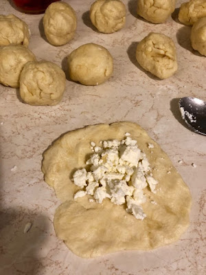 Ανοίγουμε στο πάγκο με την παλάμη μας βάζουμε στην μέση το υλικό της επιλογής μας – εδώ φέτα – και κλείνουμε σε μισοφέγγαρο και με ένα ποτηράκι το πατάμε οπως σας το δείχνω .