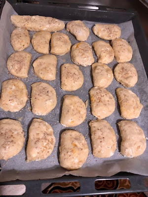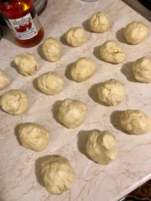 Χωρίζουμε την ζύμη σε μπαλάκια μέγεθος καρυδιού λίγο μεγαλύτερο .