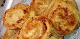 Κόβουμε τη ζύμη οριζόντια σε λωρίδες (περίπου 7-8 εκ.) και στρίβουμε την καθεμία σε ρολό.