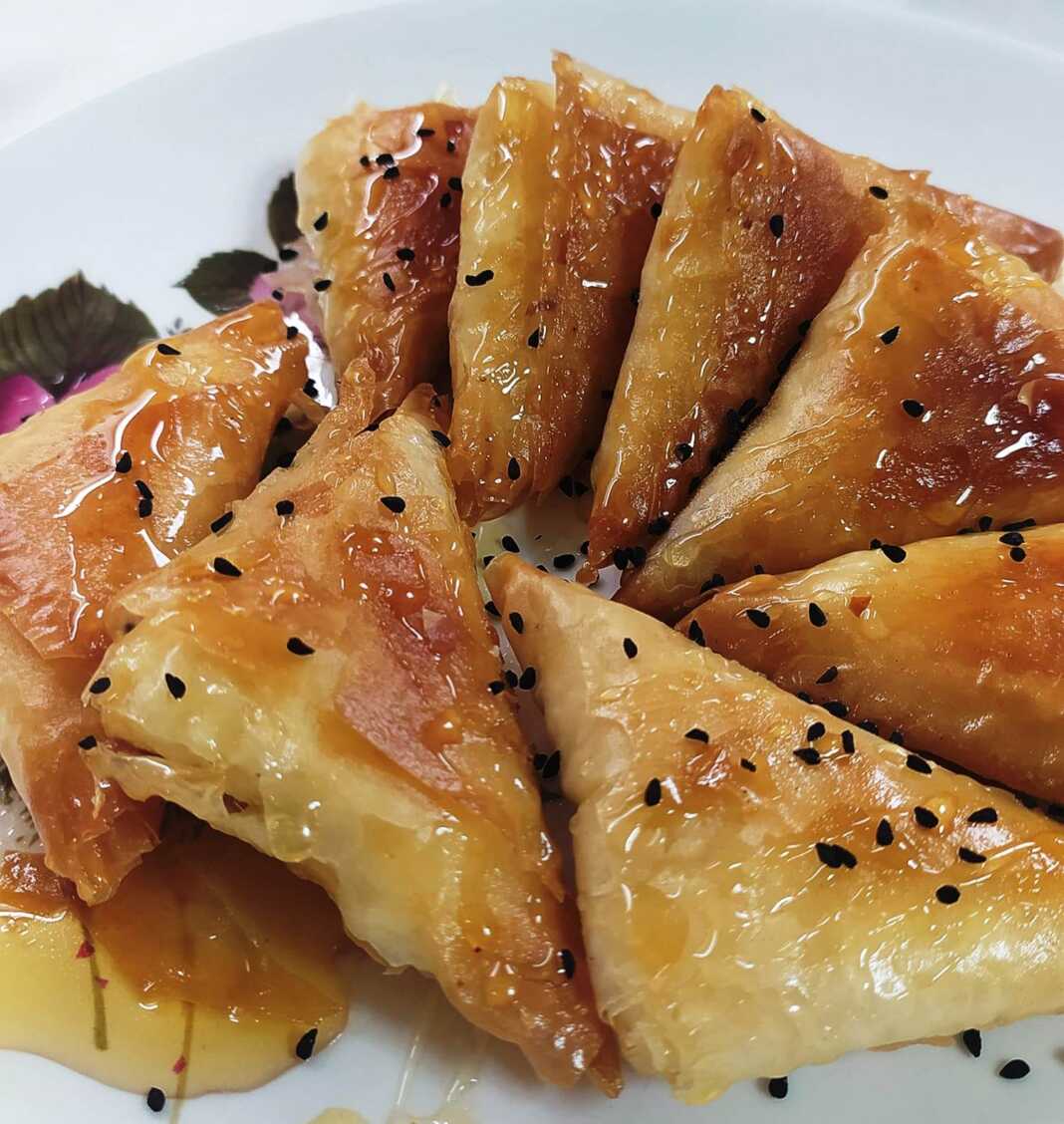 Μπορούμε εναλλακτικά να τα ψήσουμε στο φούρνο μέχρι να χρυσίσουν. Περιχύνουμε με μέλι και πασπαλιζουμε μαύρο σουσάμι.